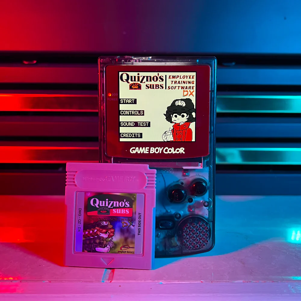 Think you've got the chops to be a Quiznos employee? Quiznos Employee Training Software is a satirical Game Boy game that blends a humorous top-down RPG with a variety of minibosses. Written/directed/programmed/composed by me with art by Brett Beemer and XernDrawz. Musical contributions by Tim Finn. Over 100 copies sold on physical cartridges.